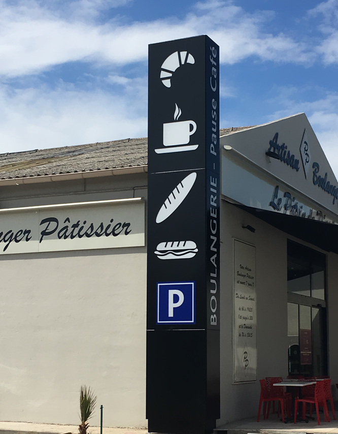Signalisation verticale, la plupart du temps elle est éloignée du magasin, le totem à vocation d'attirer le regard de votre clientèle et de fait ; qu'elle vous visite. Les formes sont multiples dans le respect d'une charte établie, mais également en tenant compte des impératifs imposés par les lois en vigueurs. L’ossature doit assurer la tenue au vent et le massif béton (où autre système d’ancrage existant) doit être dimensionné en fonction. La plupart du temps l’ossature d'un totem est en acier galvanisé . Pour les décors, le choix là encore est vaste et satisfera vos attentes. L’éclairage d'un totem est réalisé en Leds dans la majeure partie des cas. Les totems peuvent être couplés à un système d’alimentation solaire.